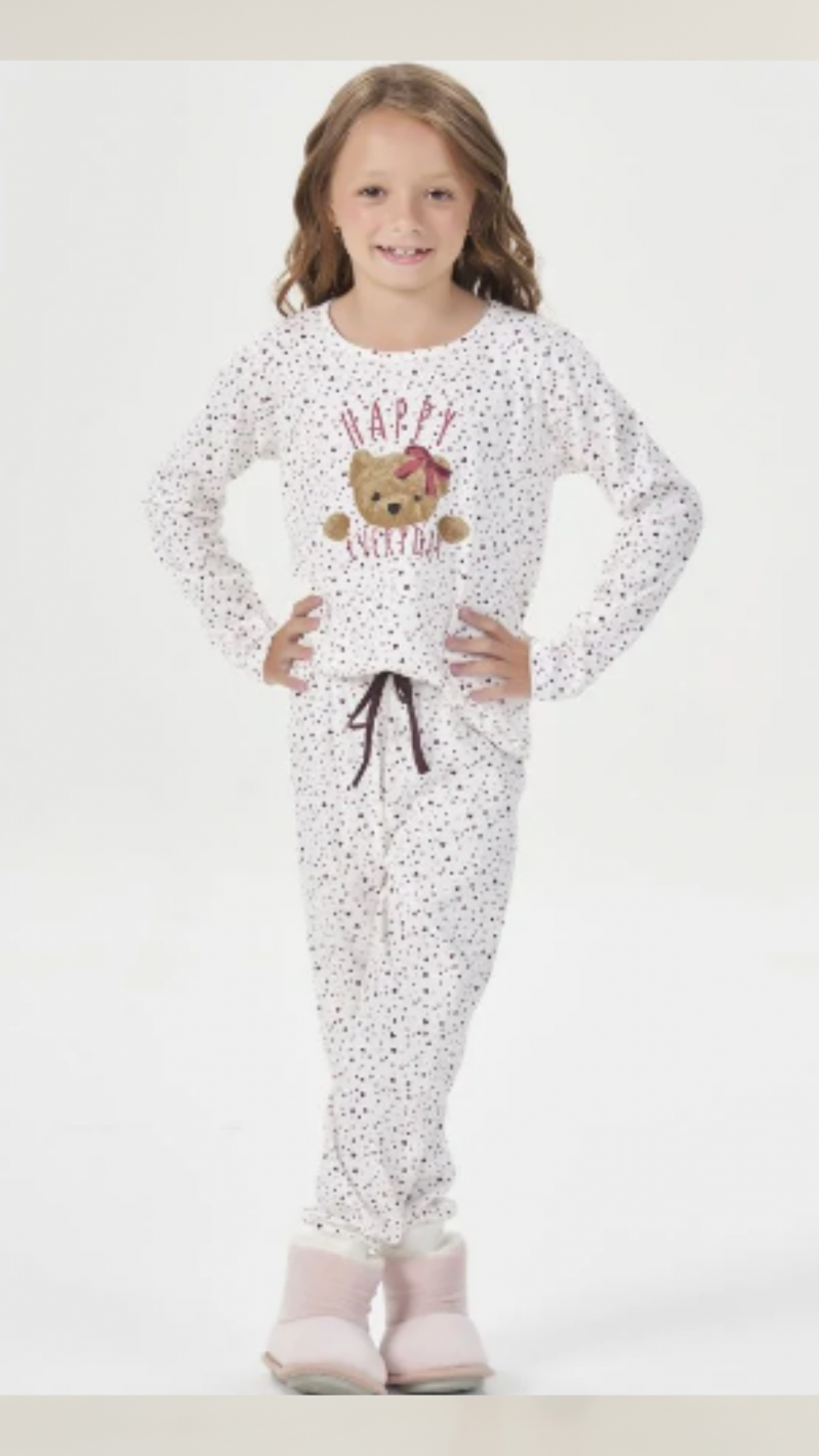 Pijama manga longa em meia malha 100% algodão com estampa rotativa de corações coloridinhos, Blusa com estampa localizada de ursinho e calça com modelagem com acabamento em punho, detalhe de falso amarrador em cadarço contrastante aplicado no centro do cós. Além de lindo tem a opção adulto para usar combinando!